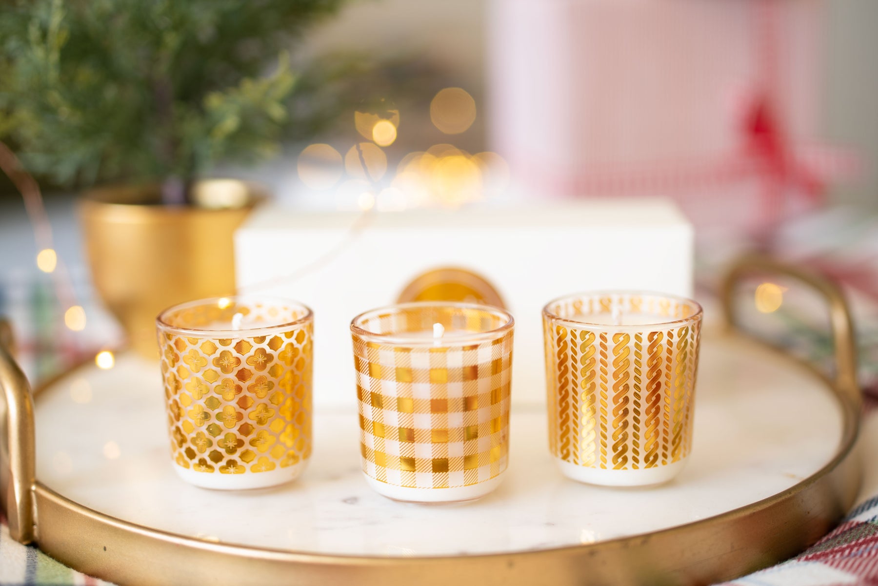 This set includes a collection of mini candles in elegant gold vessels, each with a unique and delightful holiday scent. Perfect for gifting or decorating your own space, these candles will add a touch of warmth and festivity to any room. Available with or without matches.